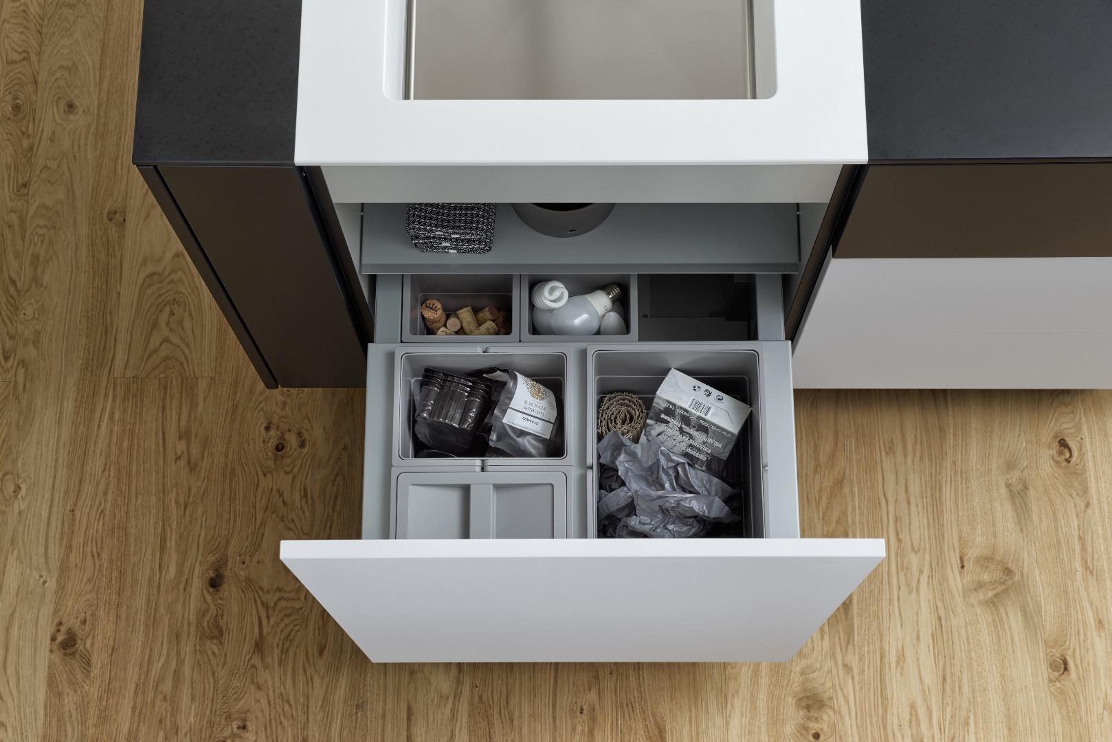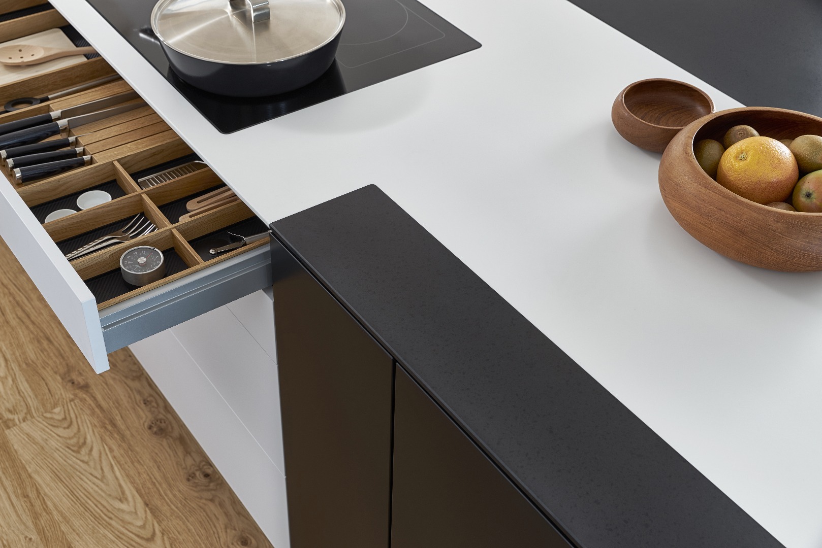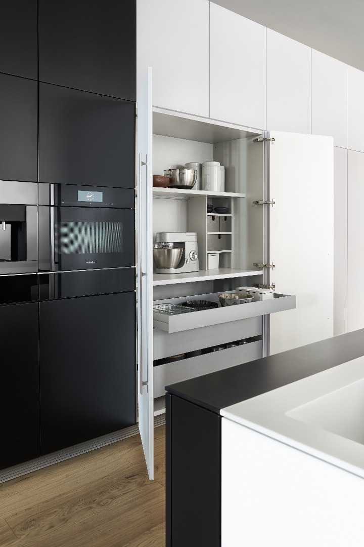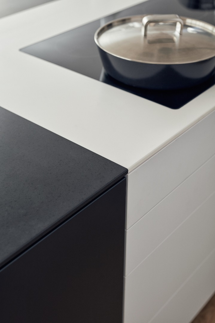 An elegant modern kitchen in Black and White that takes inspiration from a timeless simplicity in a contrasting colour combination; graphite black and arctic white.