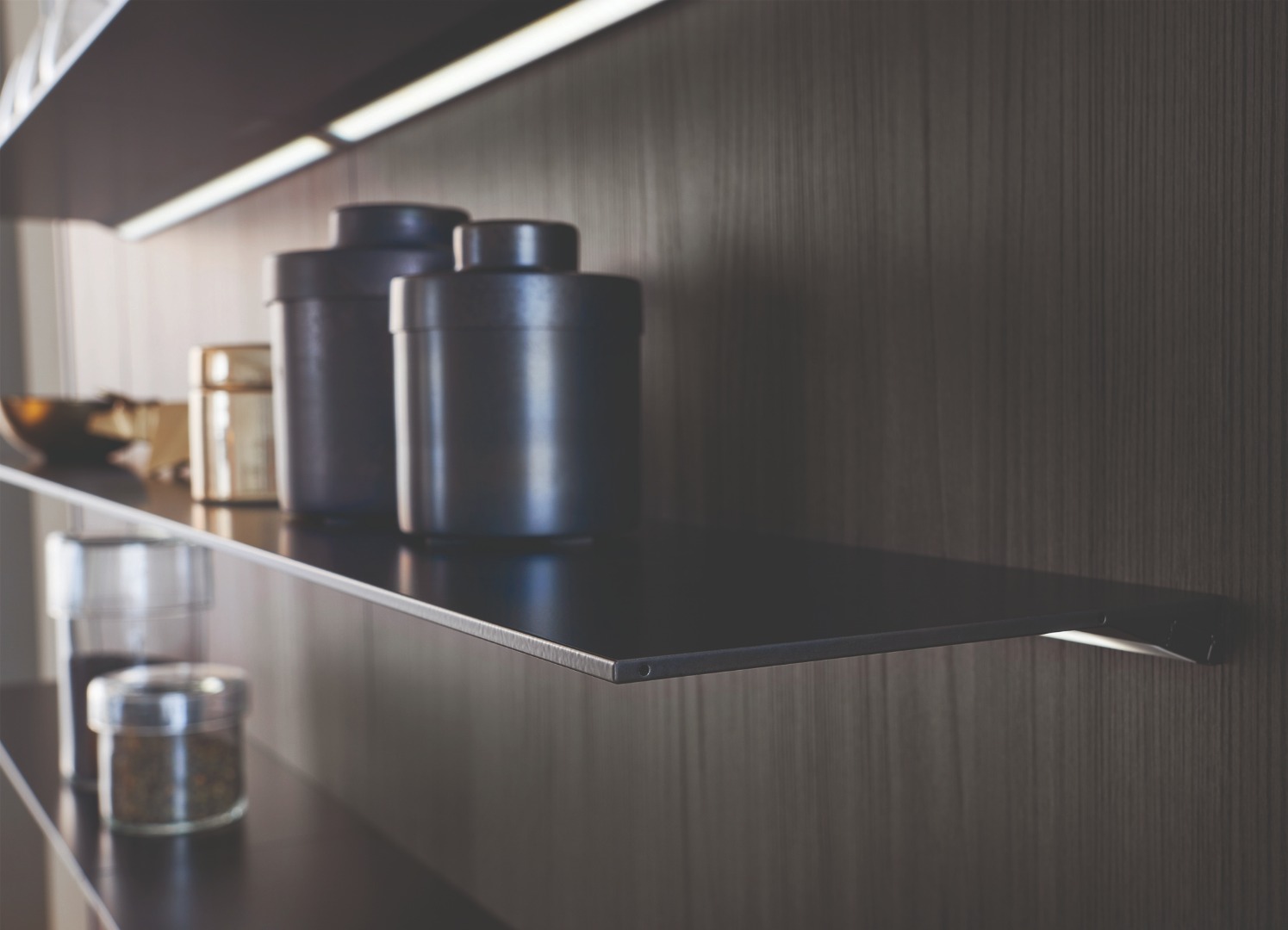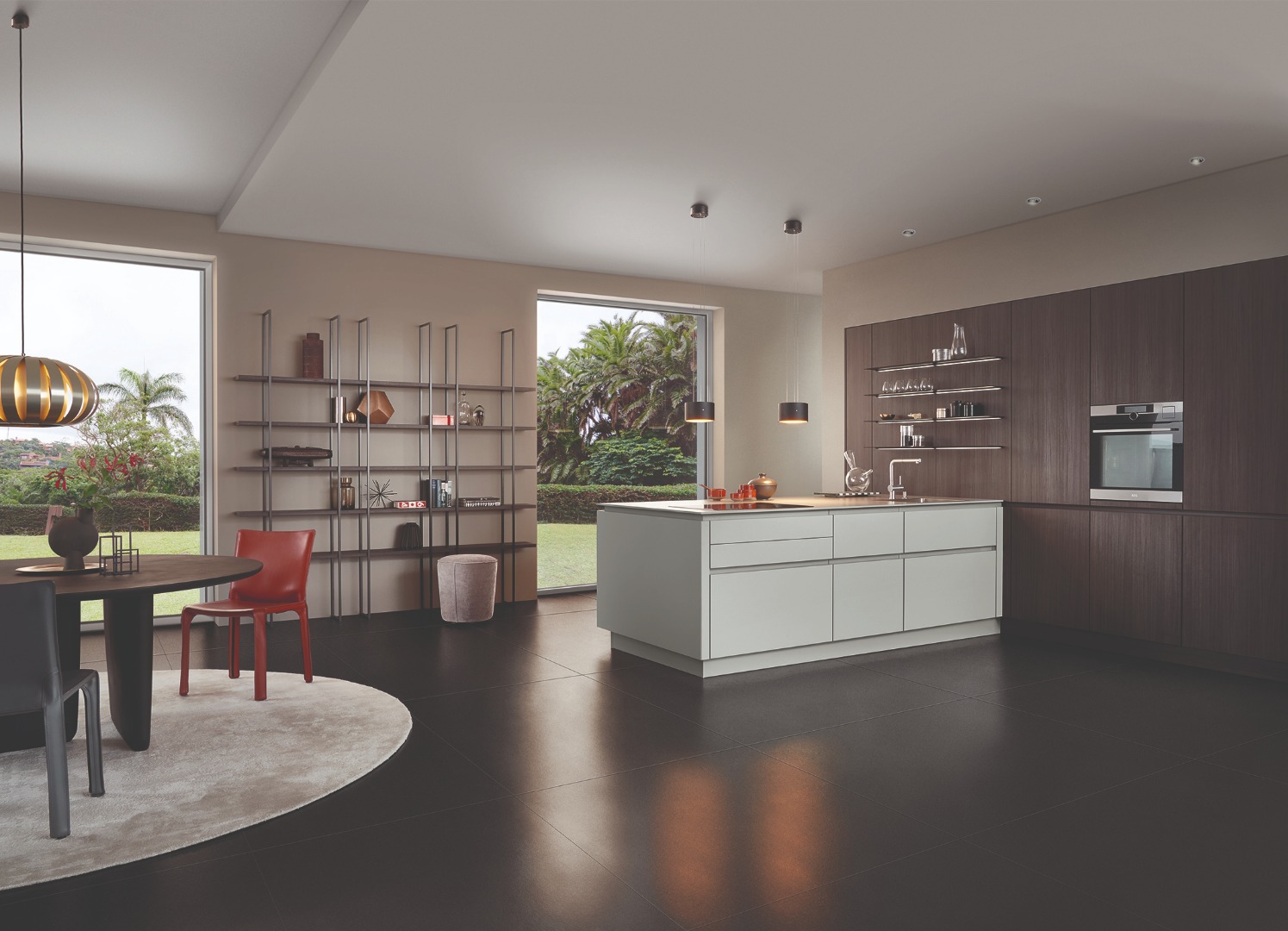The contrast of light/dark is a classic and popular surface combination in interior design. With the new colour olive grey and the wooden structure of a mountain robinia, LEICHT is now presenting this combination in a subdued, harmonious look that exudes top-class elegance. For the first time, LEICHT is presenting both surfaces together with a harmonious composition of tall unit front, island and delicate shelves.