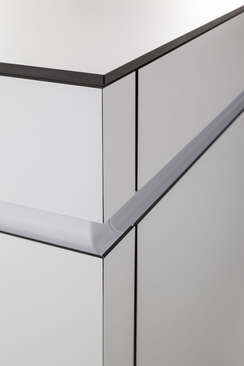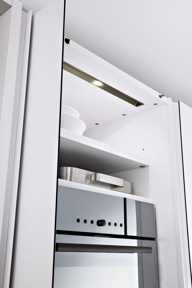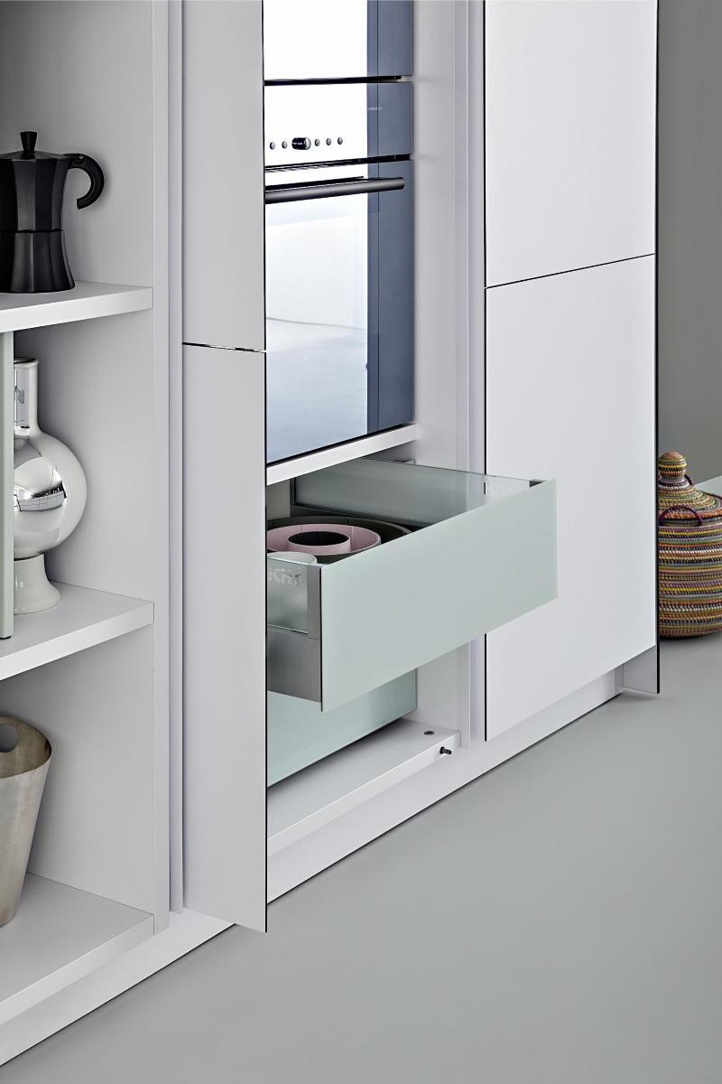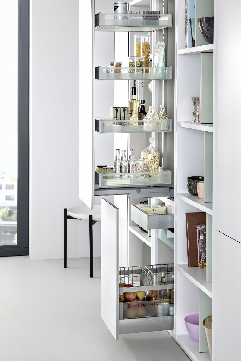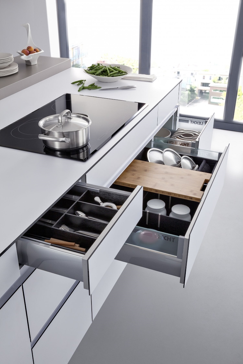 Handleless cupboards and drawers hide the innovations inside, such as the LEICHT customisable cutlery and cookware drawers.