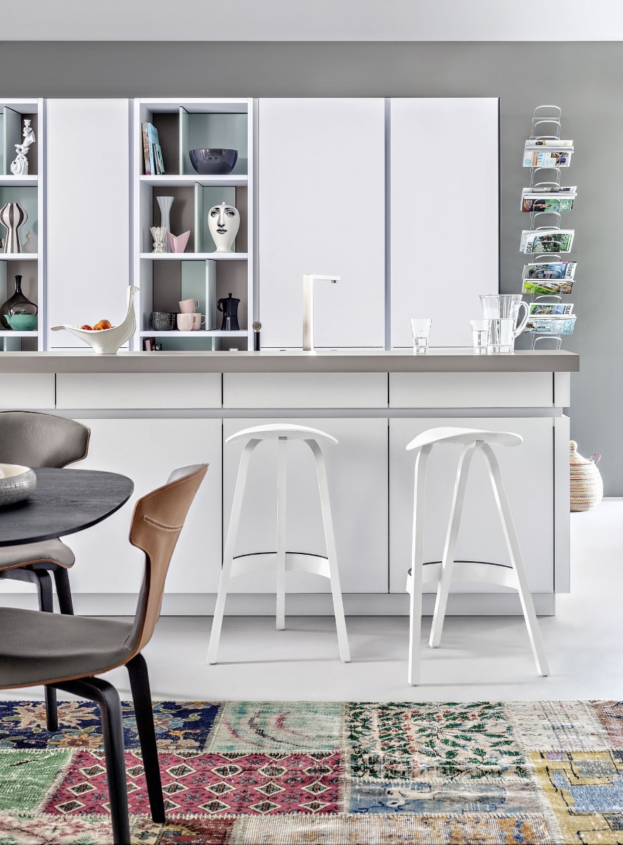 Delicate pastel colours belie the innovations of LEICHT, such as pull out shelving and integrated electrical appliances. A striking bar top brings a relaxed attitude to the kitchen.