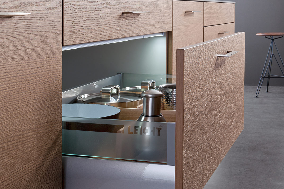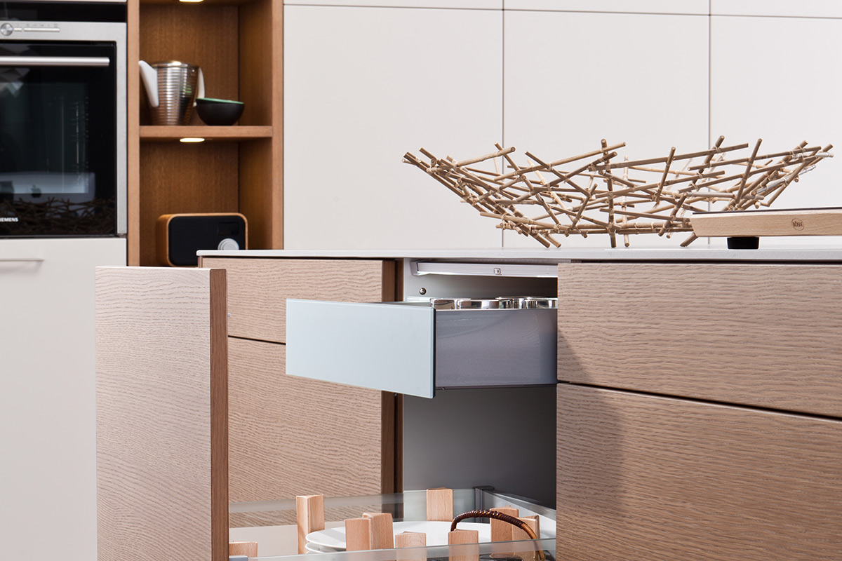 Tall kitchen units and cupboards in Arctic White compliment the Oak Marsh wood veneer, and the handleless cupboards and tall units can be opened manually or electrically.