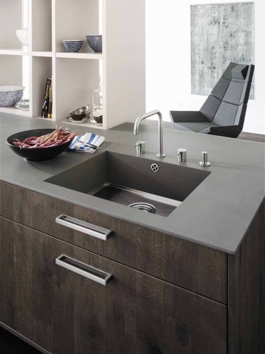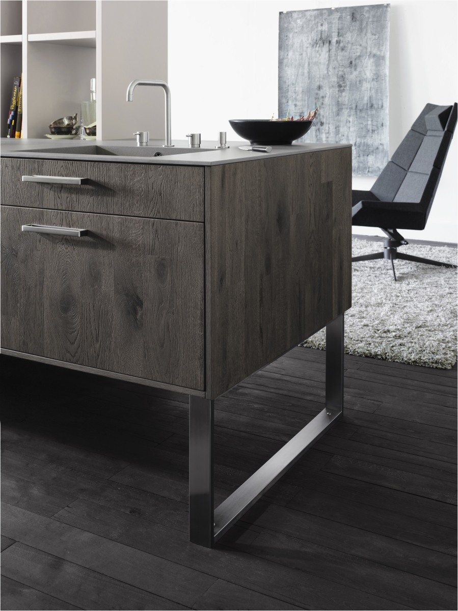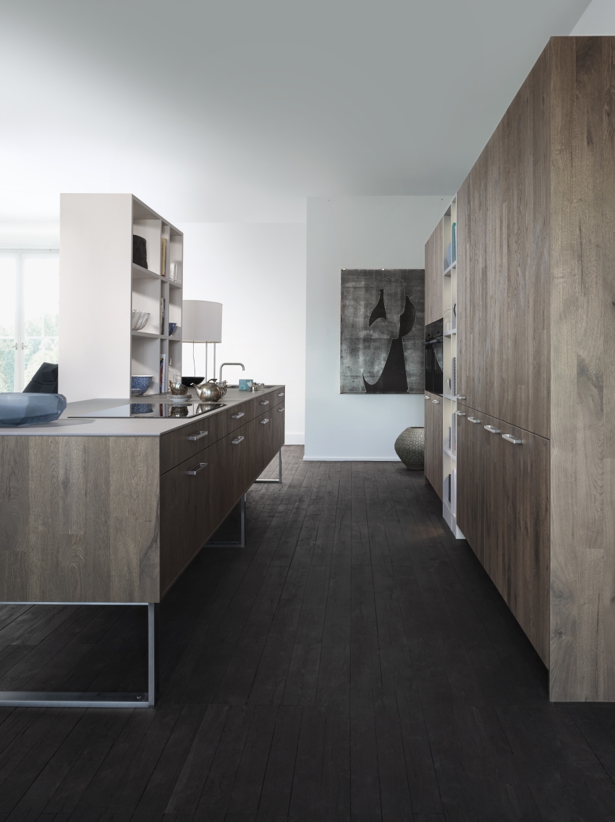 LEICHT boasts the CLASSIC-FS XYLO range as having a 'gnarled, aged wood character'. This modern kitchen certainly has character, and defines the space in which it exists by allowing for exhibiting shelving units and a 'floating' floor unit.