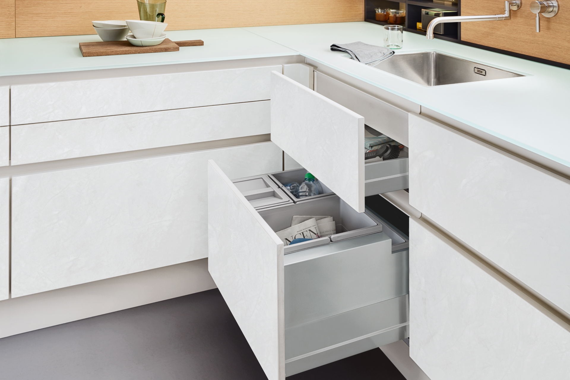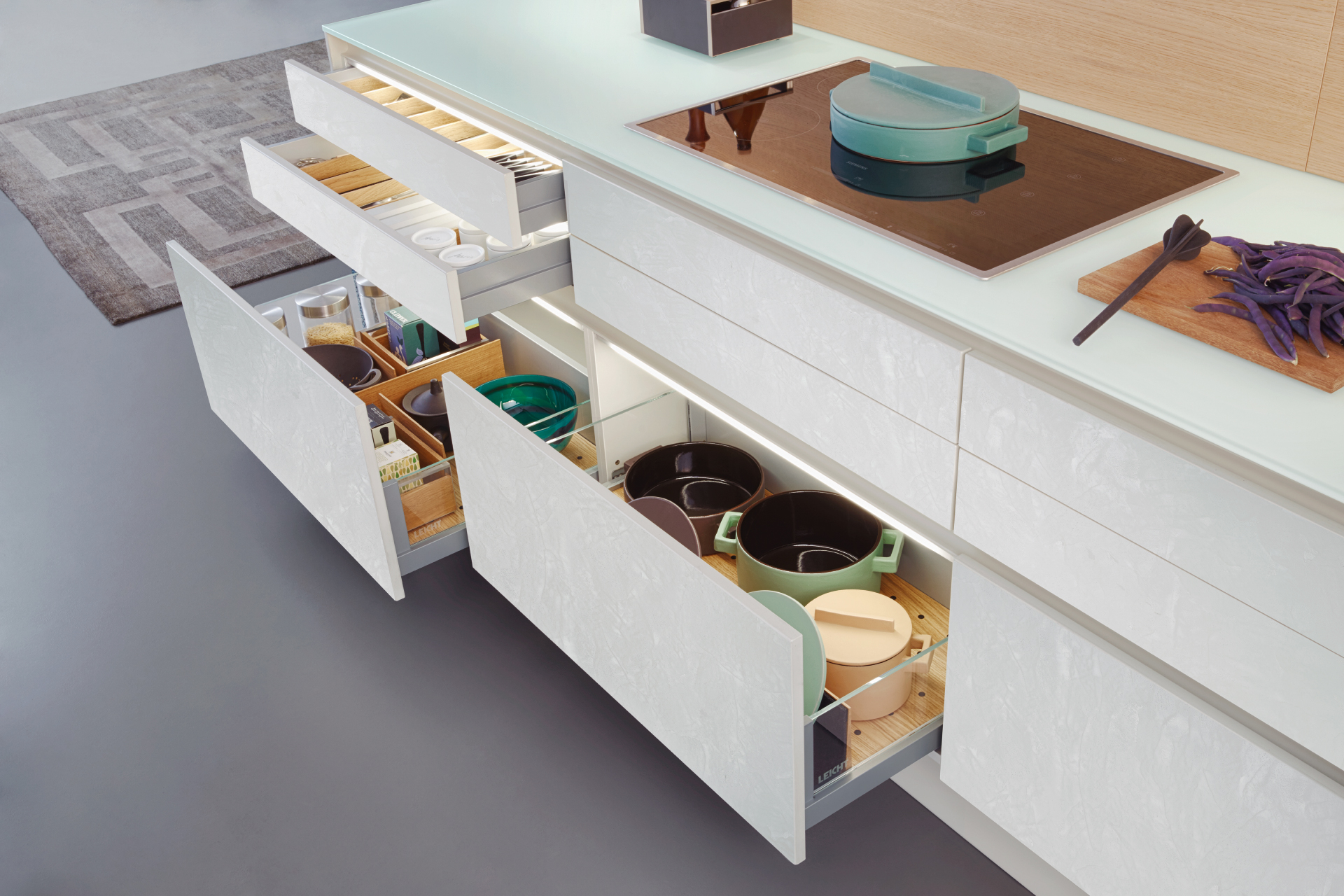 Open and Airy, this kitchen range takes inspiration from Scandinavian simplicity in design. This simplicity needs a definitive space for storage, and designated drawers are assigned for saucepans, bowls, cutlery and crockery.