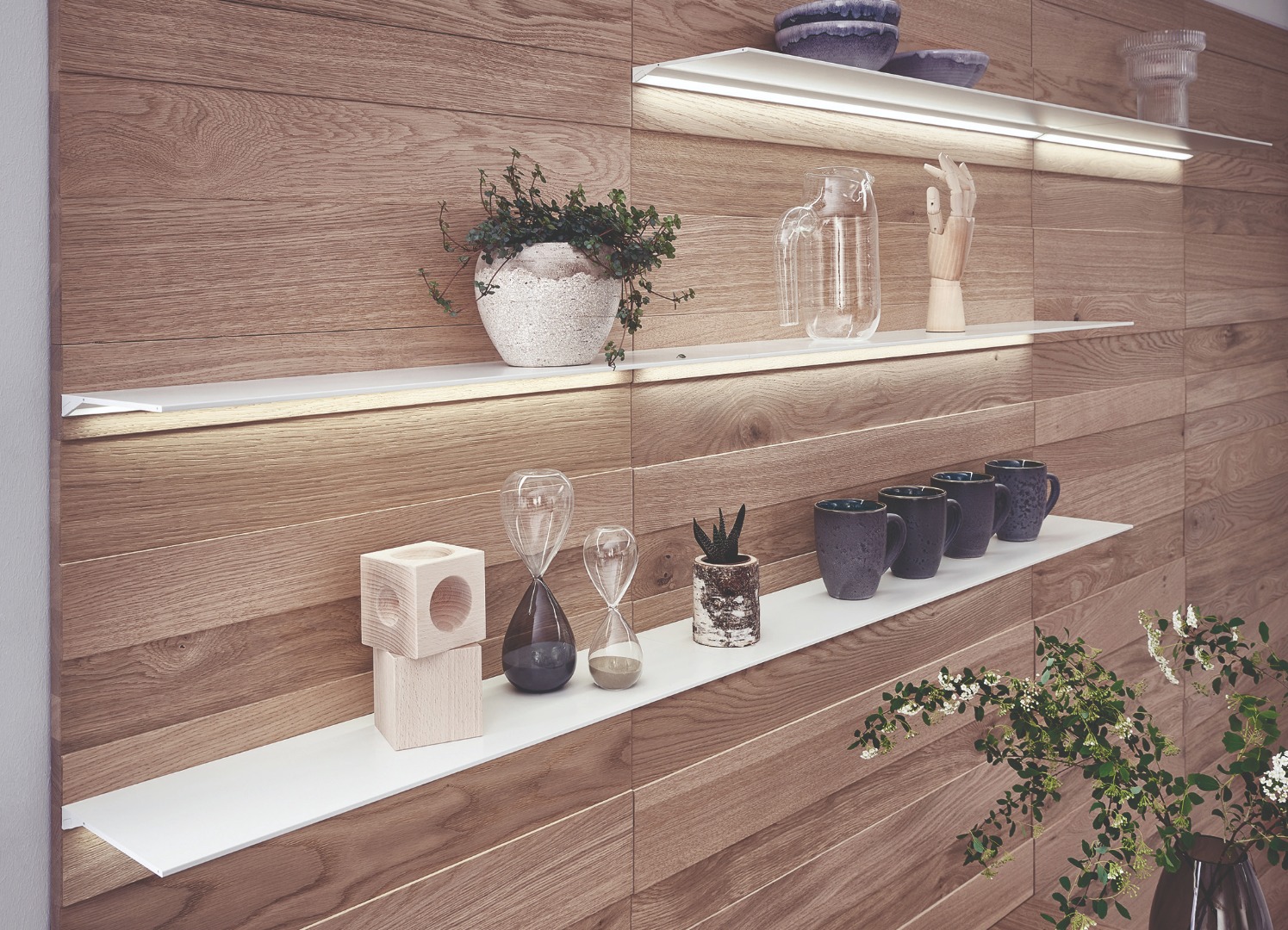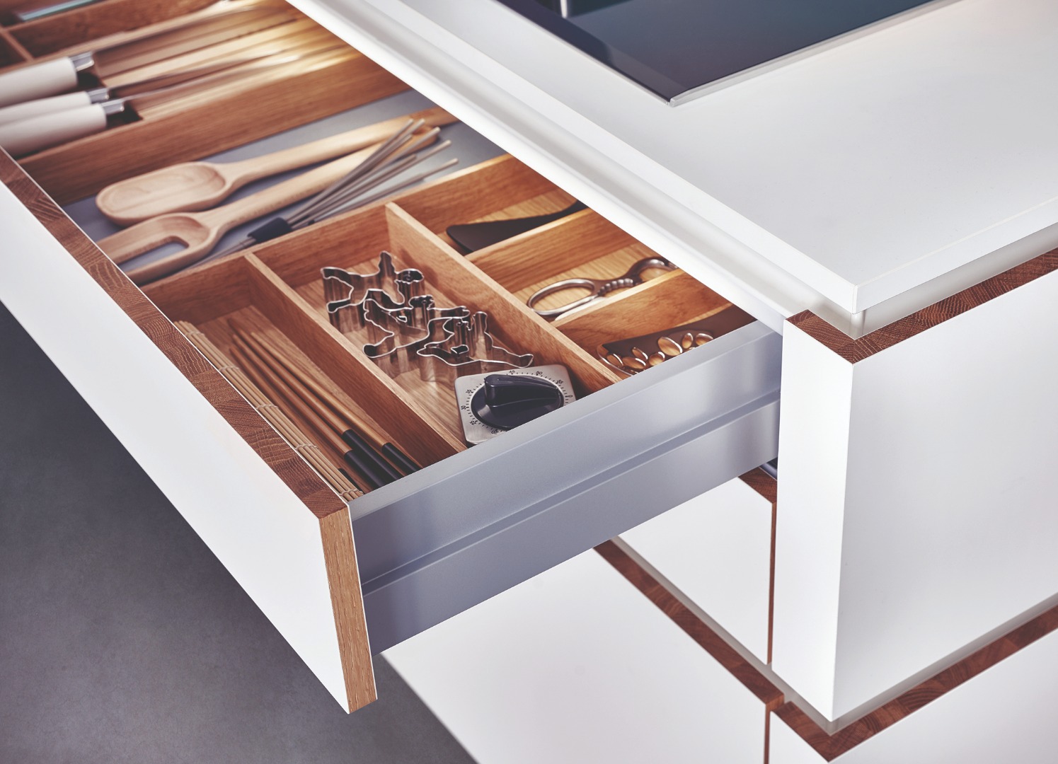The fronts consist of a laminate-covered wooden core with an anti-fingerprint finish in black or white; the surrounding edges are crafted from solid oak. In its visual reticence, Solid can be planned entirely to suit the living area and incorporated in various interior styles – the classically elegant colours of black or white as well as neutral-coloured and versatile oak make a Solid kitchen durable and homely, reflecting the values of the company LEICHT.