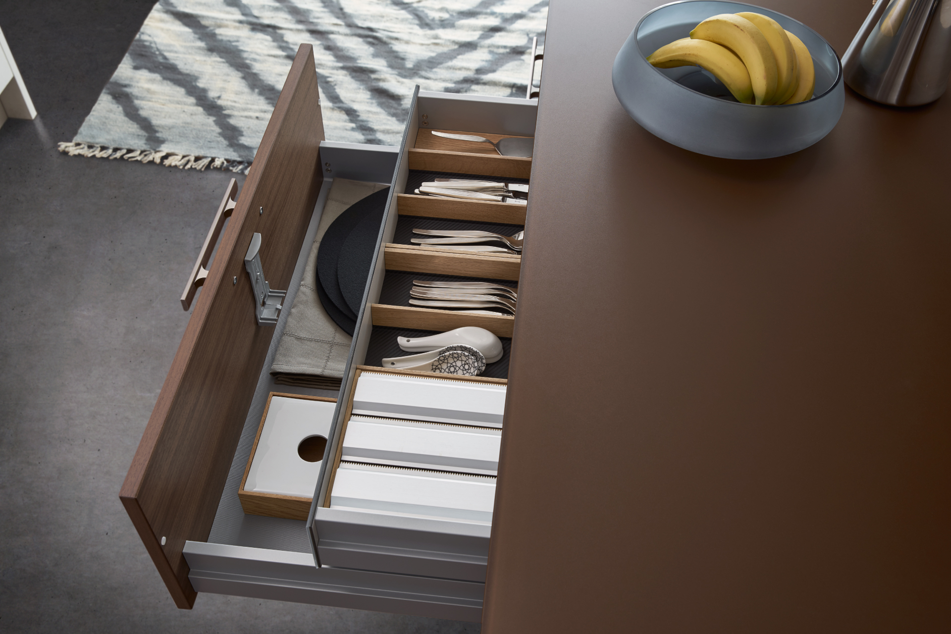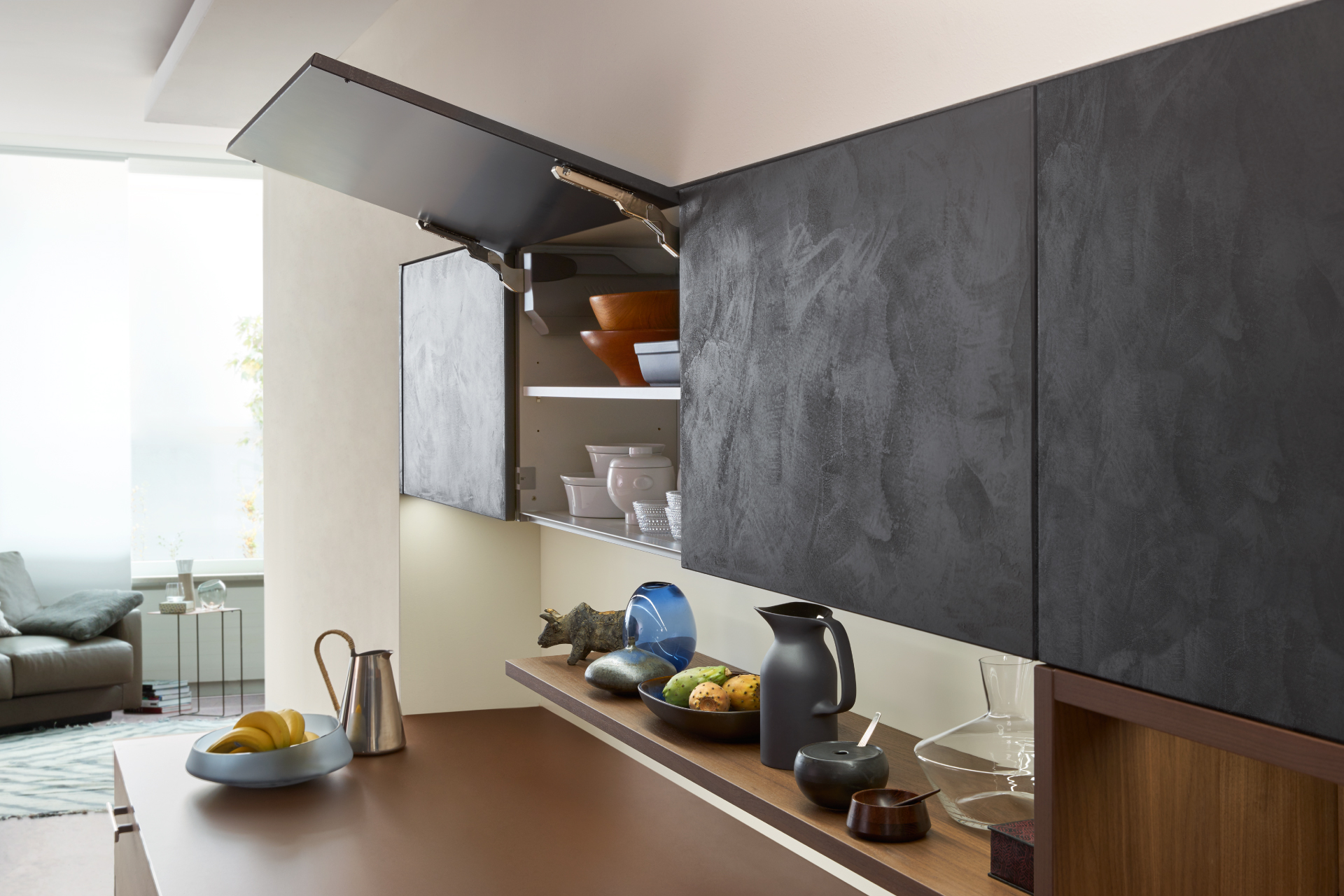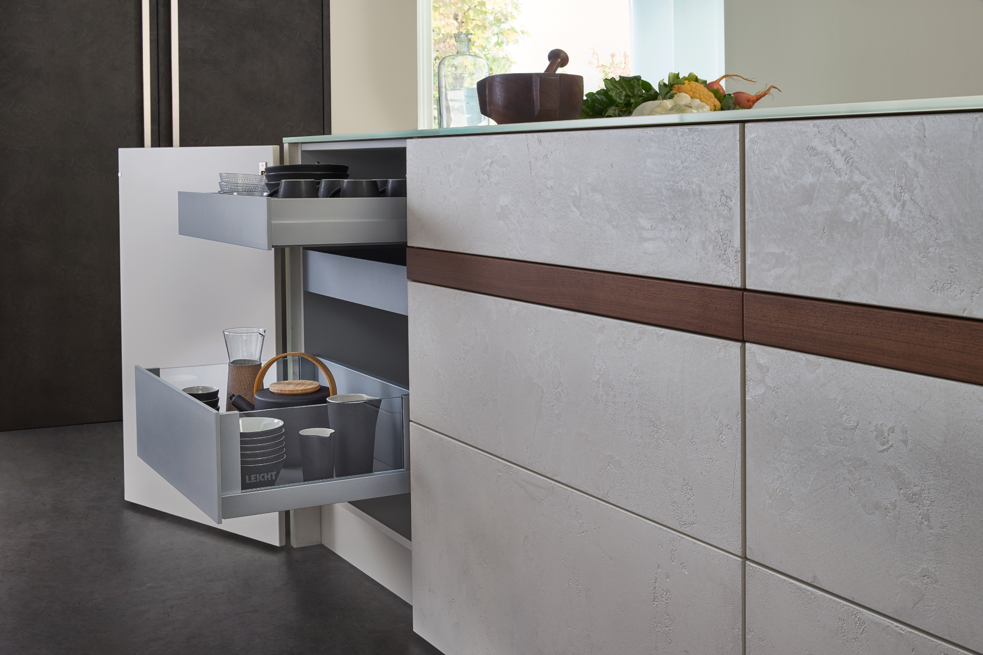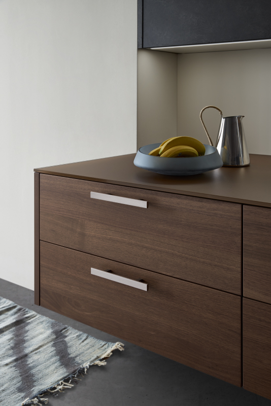 The TOPOS | CONCRETE range draws on outside elements and brings them indoors; wood and concrete kitchen countertops and fronts offer cohabitation between the natural and the man made, and retain a unique and authentic appearance.