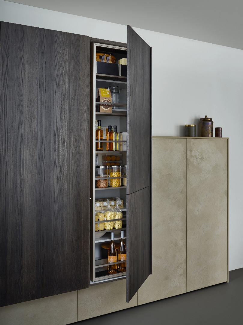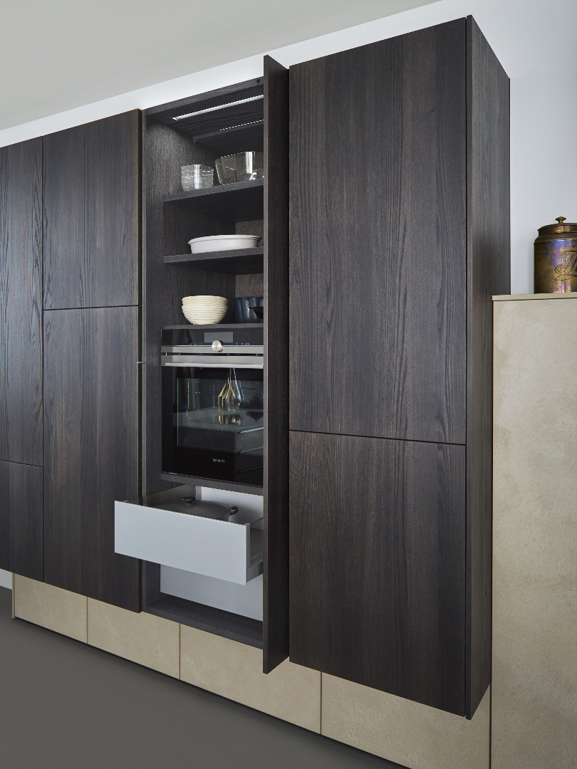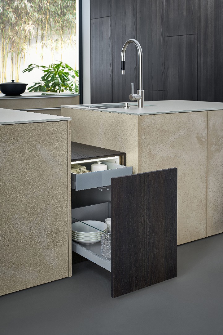 Leicht’s new modern kitchen design, the TOPOS | STONE, has a sandstone look surface and a glass worktop which appears light and textured in the room. Set here against dark tall units in wood veneer.